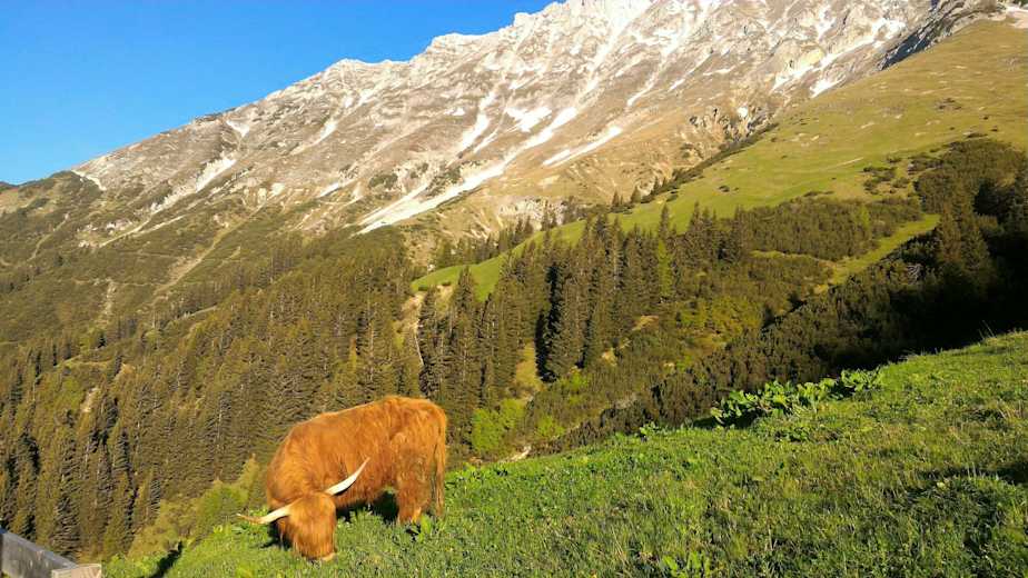 Am Höttinger Bild vorbei geht es Richtung Gramartboden, dort wo der Bergbach den Weg kreuzt, links den steilen Steig zur Alm hoch. Über Wurzeln und Felspassagen passiert man eine kleine Kletterhöhle und wird nach einem kurzen Waldstück oben bereits von den Hochlandrindern begrüßt.