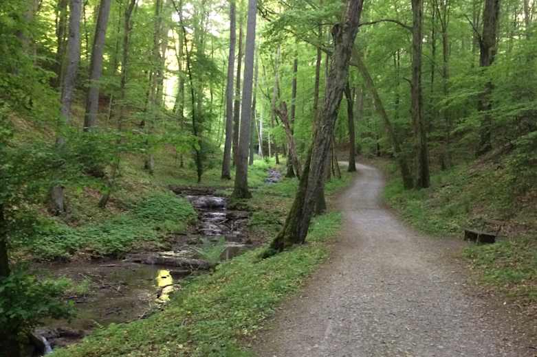 Dort nach links und bergab in Richtung Stralsbach. Im Dorf der Hauptstraße folgen. Nach der Brücke biegt man nach rechts ab und folgt dem Radweg. Nach 500 m kreuzt man die Staatsstraße und biegt nach rechts auf den Radweg ab. Bei km 8 nach rechts, überquert erneut die Staatsstraße und folgt einem kleinen Pfad in den Wald.