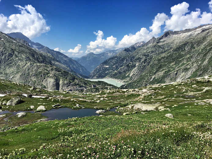 Vorbei an zahlreichen Stauseen zieht sich der Anstieg in unzähligen Kehren bis man endlich das lang ersehnte Schild auf der Passhöhe erreicht. Von hier oben kann man die beeindruckende Aussicht auf den Grimselstausee, den Oberaarsee und den Räterichbodensee und die umliegende Gletscherwelt während einer kleinen Verschnaufpause nochmal unbeschwert geniessen.