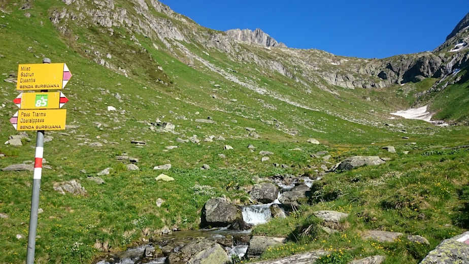 Am Oberalppass startet man auf der Route Nr. 85 und wärmt sich beim Anstieg zum Pass Tiarms auf. Vom Val Val führt ein Fahrweg größtenteils flach nach Milez, wo sich ein kurzer Zwischenstopp in der Hütte Las Palas anbietet. Nicht umsonst wird behauptet, hier gebe es den besten Kuchen im ganzen Tal. Bequeme Liegestühle und eine Lounge-Ecke verleiten dazu, die Rast etwas länger auszudehnen als geplant.