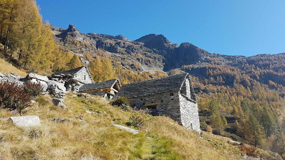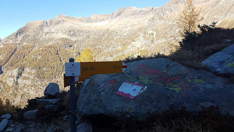 Auf einem schönen Panoramaweg läuft man südwärts und gelangt über grüne Alpweiden zum Efra-See (1.836 m). Vom See weiter über Weiden in Richtung Nordosten bis zur Corte di Cima. Hier befindet sich die Capanna d‘Efra (2.039 m), die vom Wanderverein Verzaschese geführt wird.