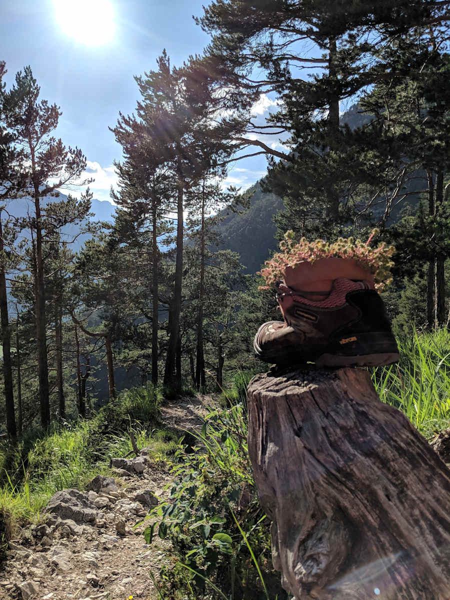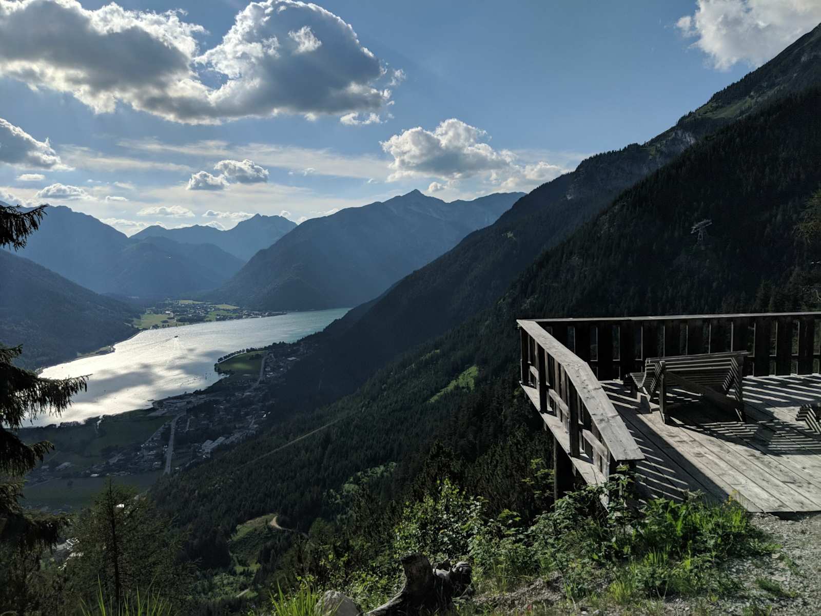 Weitergelaufen wird rechts Richtung Rofanseilbahn, nach ein paar Höhenmetern bergauf kommt man bei einer Aussichtsliege vorbei. Einmal noch die Landschaft genießen bevor es den „Schützensteig“ rechts in den Wald hinuntergeht.