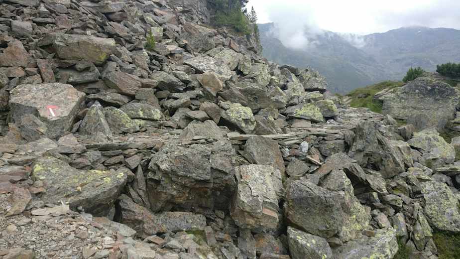 Am Wegebaum verlässt man den Zirbenweg wieder und nimmt die Abzweigung zur Viggarspitze (2.306 m). Auf der Hinterseite des Bergrückens läuft man nun zum Teil über Blockfelsen der Viggarspitze entgegen, wobei südöstlich die Tuxer Alpen nun gut sichtbar sind.