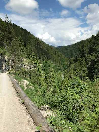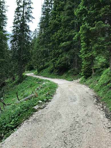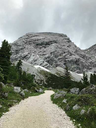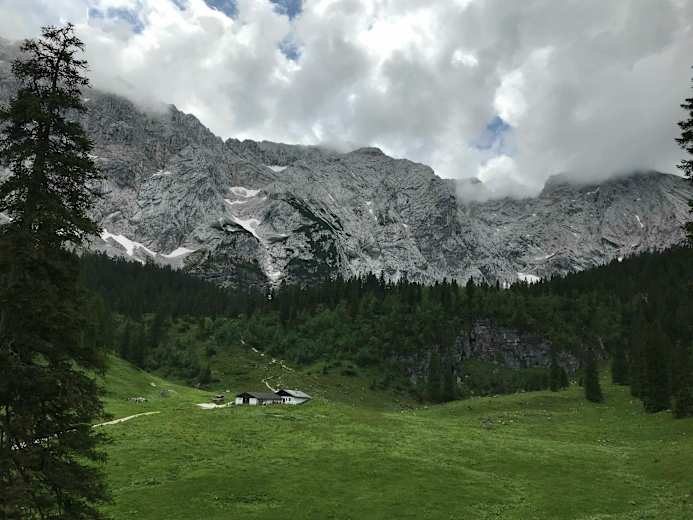 Auf einem breiten Forstweg führt die Strecke durch den Wald. Etwa auf halber Strecke passiert man die idyllische Wettersteinalm, diese liegt im Kessel vom Wettersteingebirge und bietet uns einen einmaligen Ausblick auf die umliegende Bergwelt.