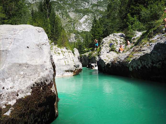 An der oberen Soča kann man hervorragend in den Fluss springen Foto: Riki Daurer, alpinonline