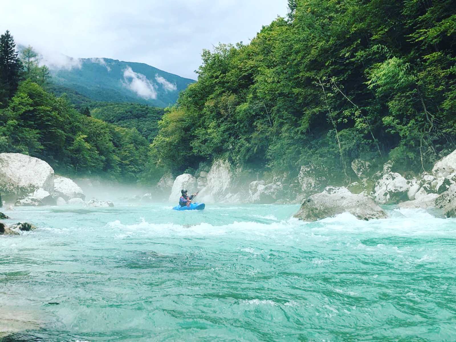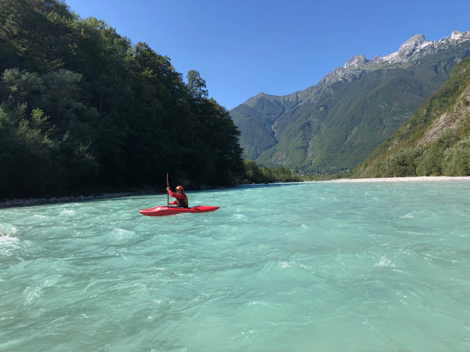 Die Prestigestrecke der Soča - ein Muss für jeden Paddler. Hier begreift man, warum die meisten Kajakfahrer jedes Jahr hierher pilgern. Anfangs noch im Kiesbett gräbt sich der Bach immer weiter ein. Genußvolle Blockstrecken im dritten Schwierigkeitsgrad begeistern.