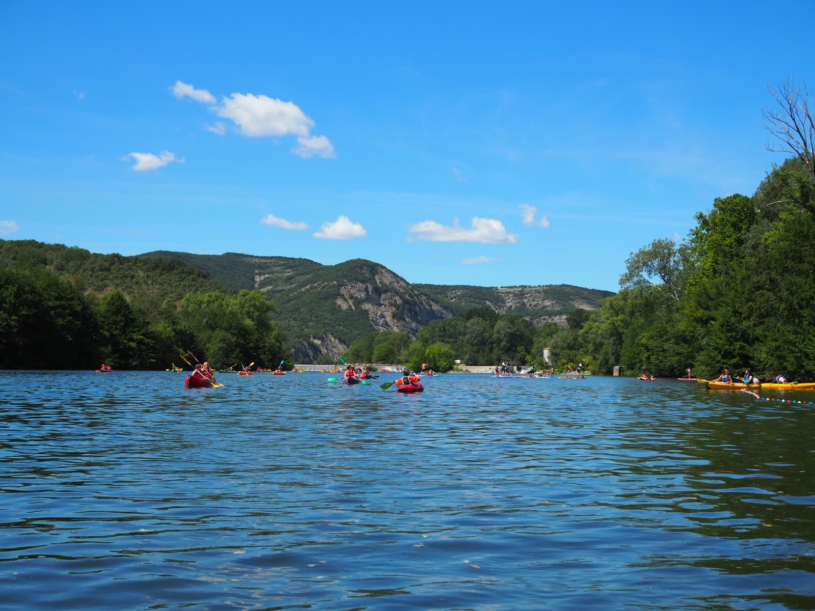 Man passiert die Ortschaft mit ihren zahlreichen Campinplätzen. Danach werden die Ufer steiler und einige Strände laden noch zum Baden und Klippenspringen ein. Die Straße ist linksufrig noch teilweise zu erkennen und Wanderwege begleiten die Ardéche, die sich noch recht zahm zeigt. Rocher de Cayre Creyt - ein großer Fels in Flussmitte markiert dann den Auftakt für den kommenden etwas turbulenteren Abschnitt. Es folgen ein paar interessante Stellen die Aufmerksamkeit fordern bis man eine Insel erreicht.