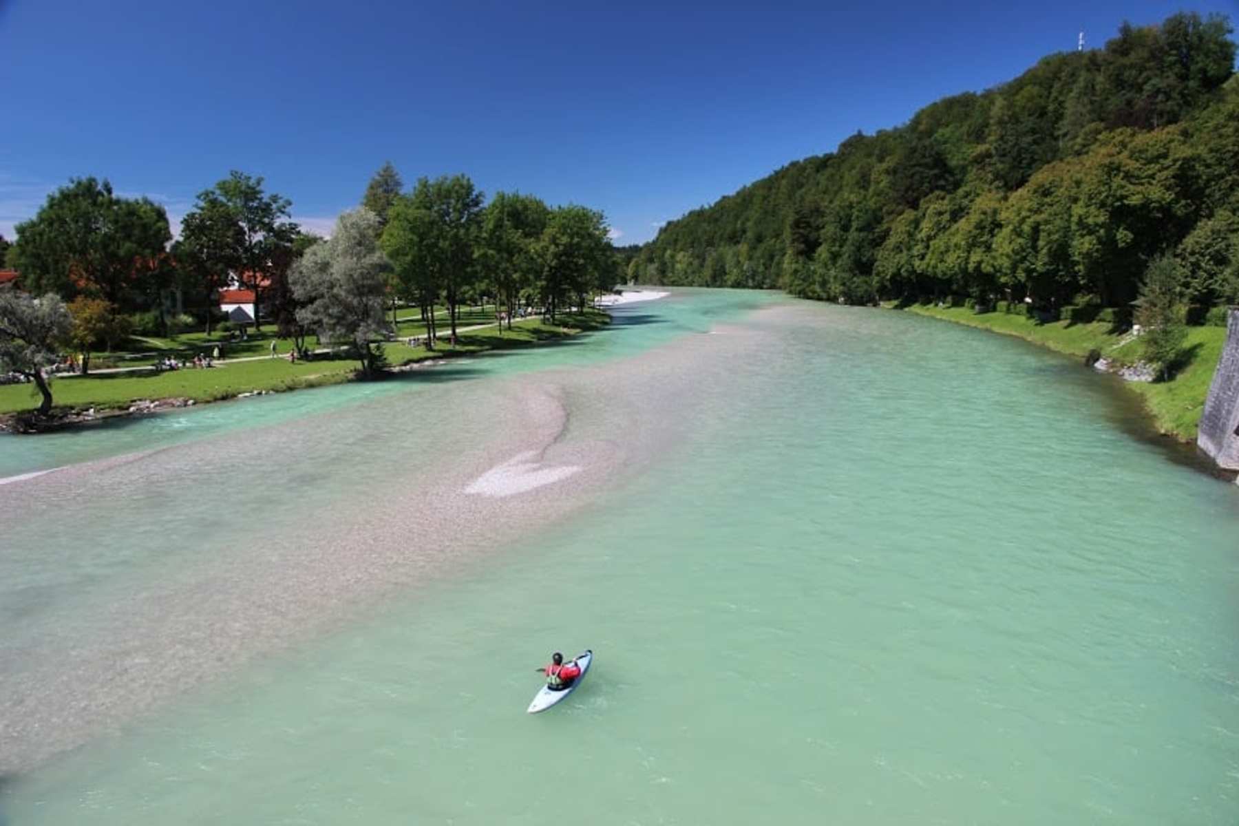 Die Isar - Natur am grünen Fluss: Die Isar zählt zu den beliebtesten Kanugewässern Bayerns. Zwischen Wallgau und München bietet der grüne Fluss eine wilde Naturlandschaft, in der die energiewirtschaftliche Nutzung kaum ins Auge fällt. Vordergründig ist sie hier ein Alpengewässer, das mit jugendlichem Ungestüm von den Bergen hinaus ins Voralpenland stürmt, zwischen Kiesbänken und Auwäldern mäandert und zu den artenreichsten Lebensräumen in Bayern zählt. Lohnende Kanutour in Bayern.