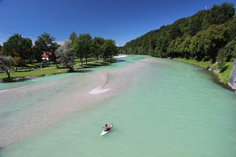 Genüssliches Flusswassern auf der Isar, umgeben von Auen und Naturlandschaften.