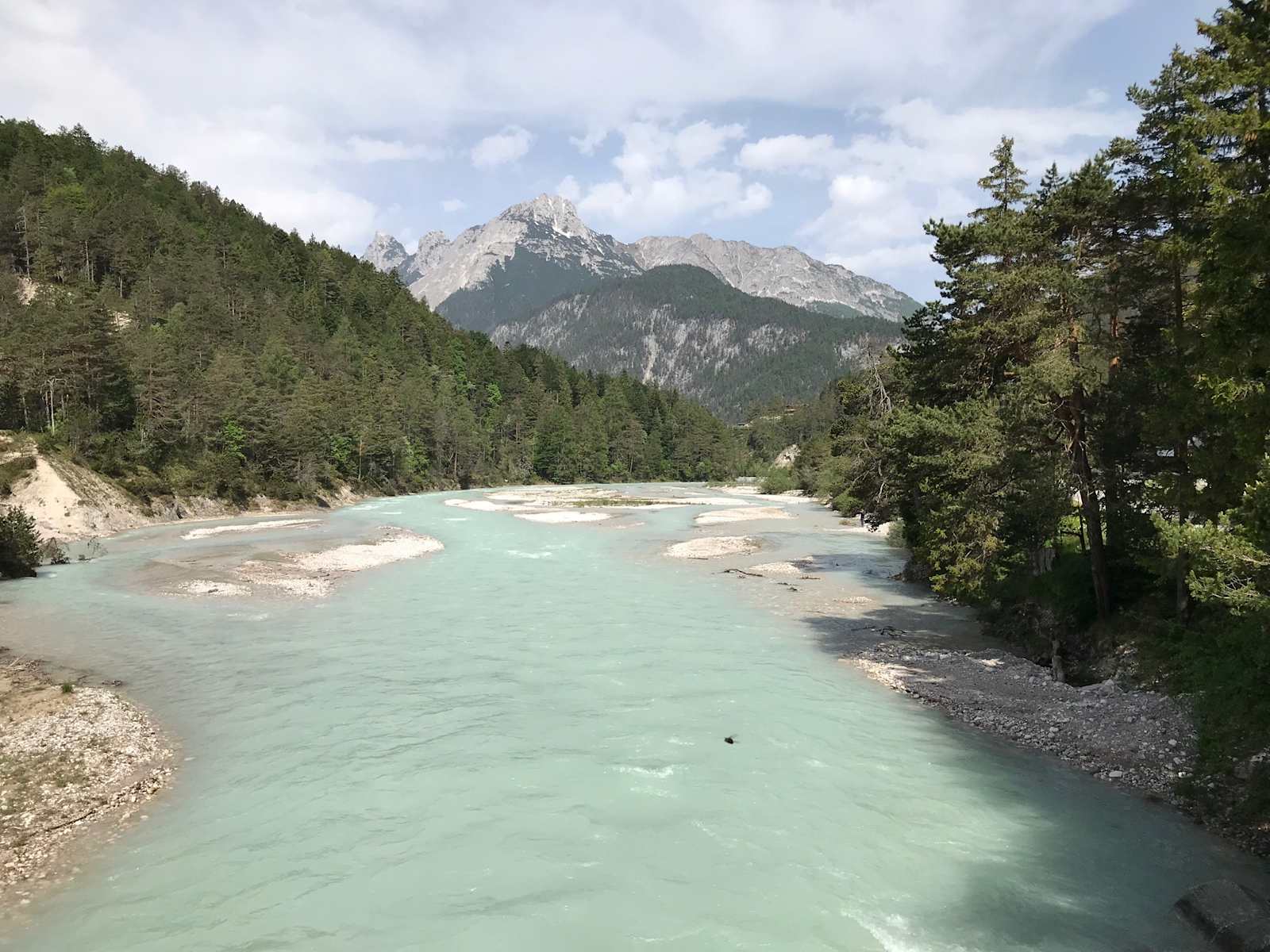 Zu Beginn fließt die Isar in zwar schneller Strömung und ohne Kehrwässer, aber ohne besondere Schwierigkeiten bei WW I+(II).