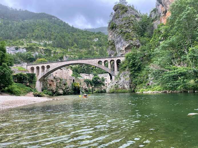 Der Einstieg befindet sich direkt im malerischen Dorf Saint-Chèly-du-Tarn orographisch links auf einer Kiesbank unter der Brücke. Diese Etappe besteht großteils aus Zahmwasser, also auch für wenig erfahrene Paddler und Flusswanderer möglich.