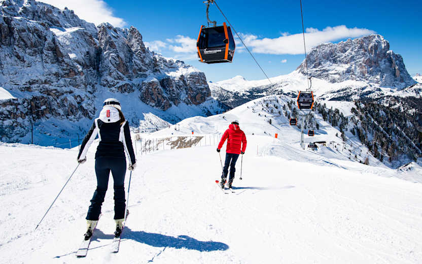 In Wolkenstein geht man ein kurzes Stück zu Fuß zum Sessellift Costabella. Eine kurze Abfahrt noch, dann ist man an der Gondelbahn Dantercepies angekommen. Bis zu einem Berghang oberhalb des Grödner Jochs bringt sie einen hinauf, dann geht es auf breiten, langen Pisten hinunter, bis nach Colfosco.