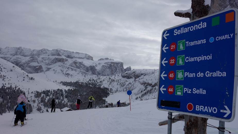 Die Runde ist durchgehend mit orangefarbenen Schildern mit der Aufschrift „Sellaronda" markiert. Einen guten Überblick über alle Skigebiete und den Routenverlauf bietet die interaktive Skikarte.