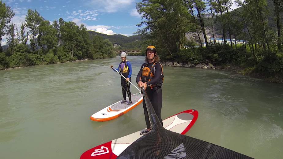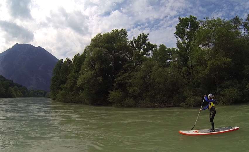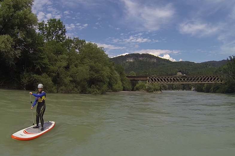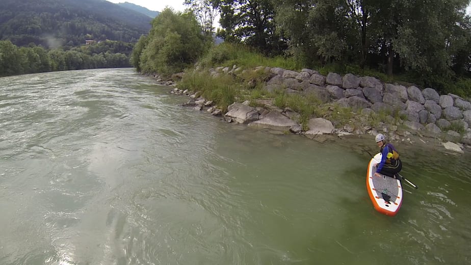 Den Schwall selbst ganz in der Mitte durchfahren – und beim ersten Versuch ruhig am SUP knien. Wer will kann jetzt eine kleine Surfsession einlegen oder man fährt gleich bis zur Brücke weiter. Nach dem letzten Schwall direkt unter der Brücke befindet sich der Ausstieg gleich rechts. Über den Schotter geht es direkt zum Parkplatz hoch.