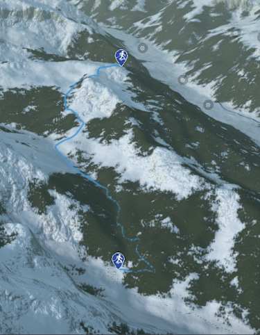 Auf dem Alpenrosenweg gelangt man zu den Toajeboden. Auf etwa 1.700 m tritt man aus dem Wald und geht im verschneiten Latschengürtel zum kleinen Gipfelkreuz (1.852 m).