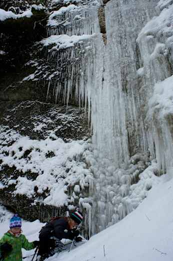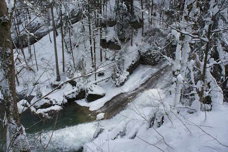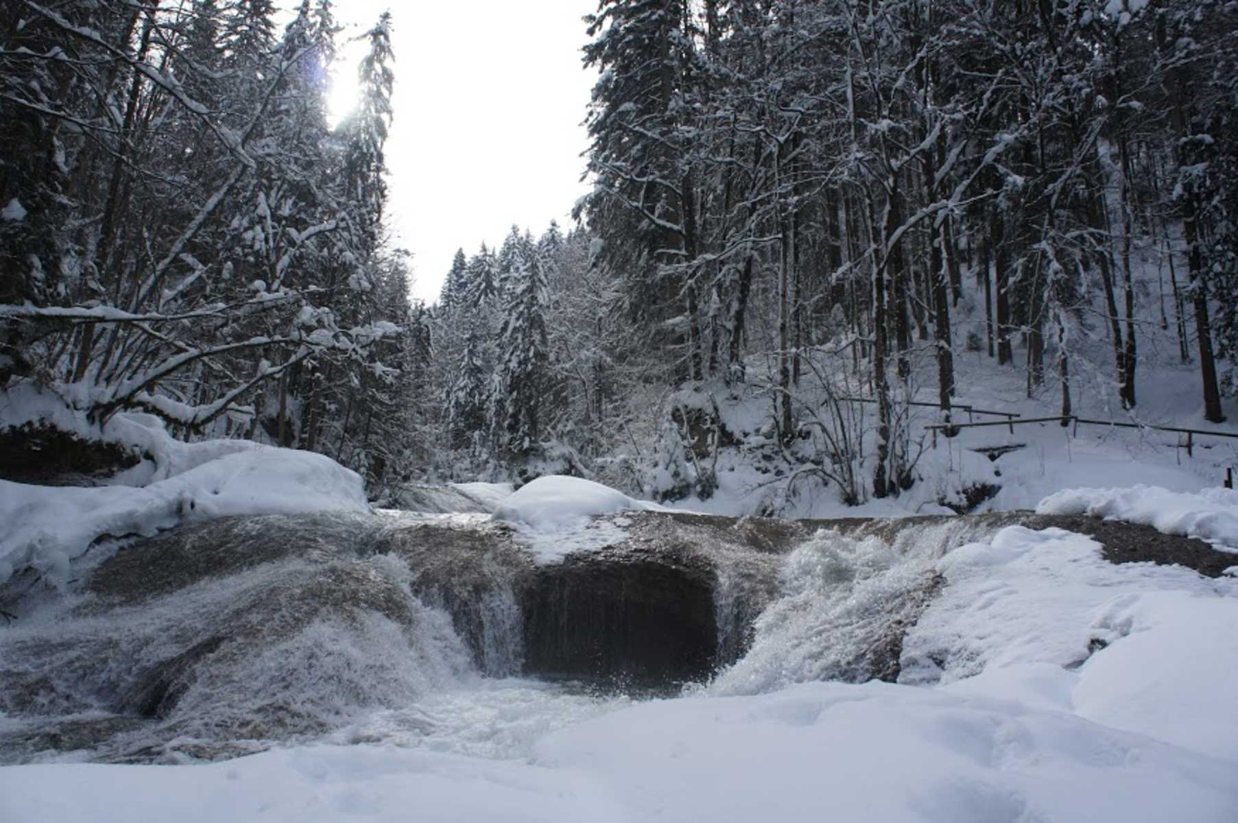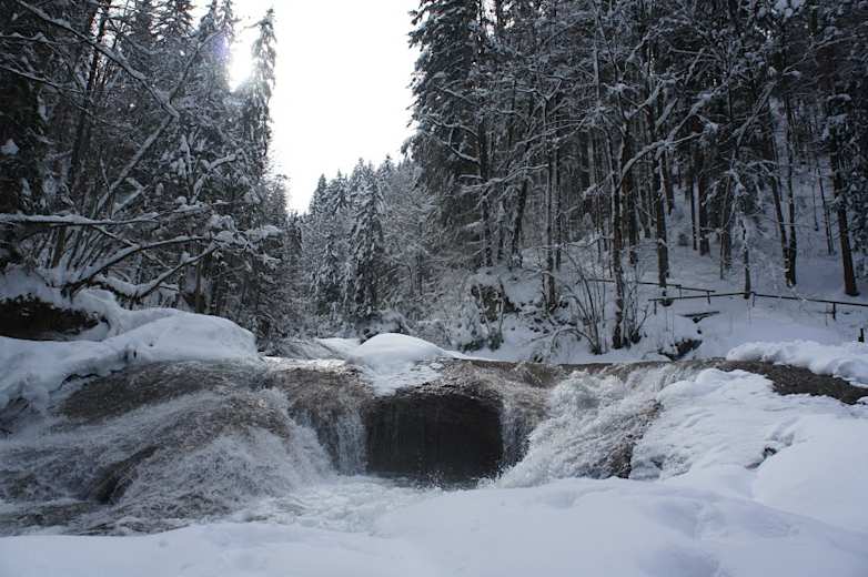 Diese Schlucht ist ein einziges Erlebnis: Der Obere Argen hat sich dort in den Jahrhunderten seinen Weg durch die Felsen freigespült und zeigt seine unbändige Kraft. Am Parkplatz bei der Eistobelbrücke geht es los. Beim Infozentrum ist das Kassenhäuschen und von dort führt der Weg steil in den Talgrund. An dieser Stelle sei noch einmal ausdrücklich erwähnt: Der Eistobel ist im Winter offiziell gesperrt und wer sich runter wagt (das sind nicht wenige) tut dies auf eigenes Risiko. Verschlossen ist der Zugang nicht, aber der steile Weg hinunter zum Eistobel erfordert Mut und gute Schneeschuhe. Unten glücklich angekommen rechts halten. Punkten kann der Eistobel mit seinen vielen Möglichkeiten. Vier Touren sind hier möglich.