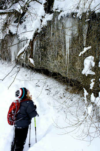 Schneeschuhtour von der Eistobelbrücke auf Eistobel und Riedholzer Kugel (1.065 m): Zu jeder Jahreszeit ist der Eistobel ein Erlebnis. Im Winter ist diese wilde Schlucht offiziell gesperrt: Wer dort hinunter steigt, tut das auf eigene Gefahr. Im Eistobel wartet eine Welt aus bizarren Eisskulpturen auf die Schneeschuhgeher. Von dort bietet sich ein Aufstieg zur Riedholzer Kugel an. Wie auf einer Kinoleinwand präsentiert sich dort der Bregenzerwald in einem beeindruckenden Panorama. Lohnende Tour in den Allgäuer Alpen in Bayern.