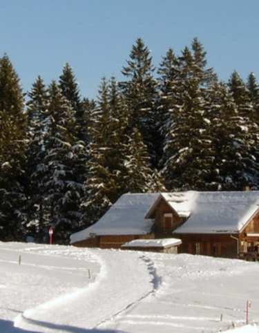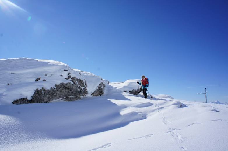 Nun den Stuibenbach überqueren und auf die andere Talseite wechseln. An der Flanke vom Seilhenker (der Berg heißt tatsächlich so) geht es weiter hinauf. In weiten Serpentinen erreichen die Schneeschuhgeher eine Hochebene. Die Käseralpe ist bereits zu sehen. Nur noch 500 m bis zum Ziel. Leider ist die Alpe nur im Sommer bewirtschaftet und ein beliebtes Ziel der Mountainbiker. Trotzdem lohnt es sich, bevor die Schneeschuhgeher den Rückweg antreten, hier den Rucksack abzulegen und zu pausieren. Der Blick geht auf den verschneiten Älplesattel und die markante Höfarts. Auf dem gleichen Weg geht es zurück zum Ausgangspunkt bei Oberstdorf.