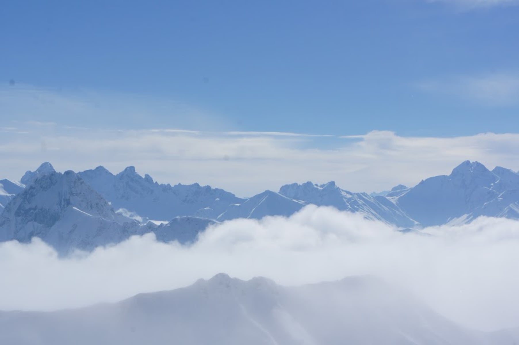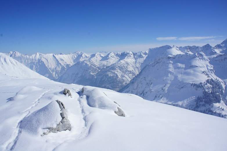 Weiter geht es mit den Schneeschuhen zum Koblatsee. Hier lohnt es sich, den Ausblick zu genießen. Vom Koblatsee sind es nur noch 500 m bis der Laufbichlsee, das Ziel dieser Tour, erreicht ist. Auf 2.012 m liegt das kleine Gewässer. Der Blick ist großartig. Direkt hinter dem Laufbichlsee ragt der Große Daumen auf. Runter mit dem Rucksack und den Ausblick genießen. Deutlich zeichnen sich der Hochvogel mit seinem markanten Gipfel und die Roßzähne im Bergpanorama ab. Auf dem gleichen Weg wie beim Aufstieg geht es wieder hinunter nach Oberstdorf. Unterwegs lohnt sich eine Einkehr im der DAV Hütte Edmund Probst Haus. Wenn sich das Nebelhorn von seiner sonnigen Seite zeigt, ist diese Tour jeden Tropfen Schweiß wert.