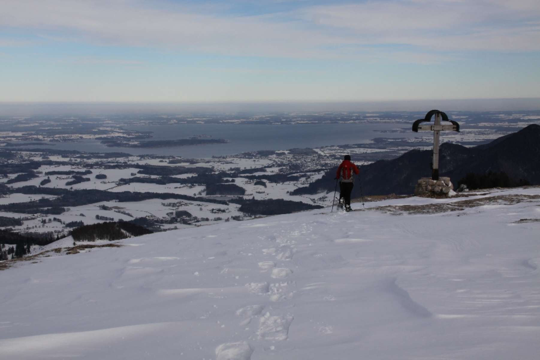 Geradeaus führen die Spuren zum Abereck, wir wenden uns nach links und wandern leicht steigend, an den Laubensteinalmen vorbei, hinauf auf den breiten Rücken des Laubensteins. Mit grandiosem Blick zum Chiemsee und über den Chiemgau bummeln wir über den flachen Gipfelrücken zum nach Osten vorgeschobenen Gipfelkreuz.
