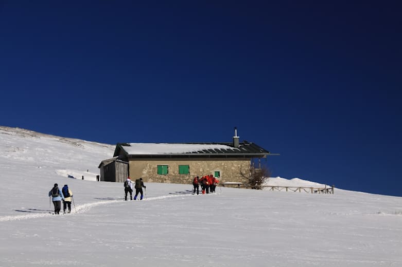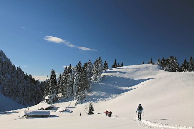 Der Anstieg über die Laubensteinalm ist einfach und selten lawinengefährdet – so richtig gut geeignet als allererste Schneeschuhtour in Oberbayern.