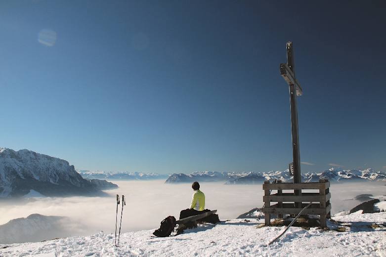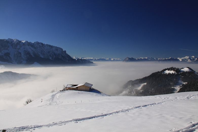 Nur kurz ist hier, in den Chiemgauer Alpen, die Schneeschuhsaison, denn sobald die Märzsonne ihre wärmenden Strahlen in die Südseite am Brennkopf in Tirol schickt, schmilzt der Schnee auf den sanften Grashängen.