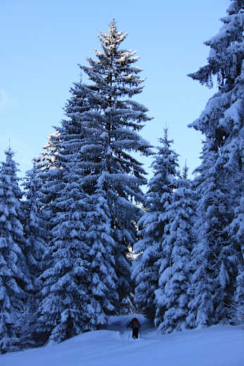 Im Abstieg orientieren wir uns an unserer Aufstiegsspur, bei guten Bedingungen können wir den Gipfelhang auch am Rande der Abfahrtsroute entlang einzelner Bäume hinunterwandern.