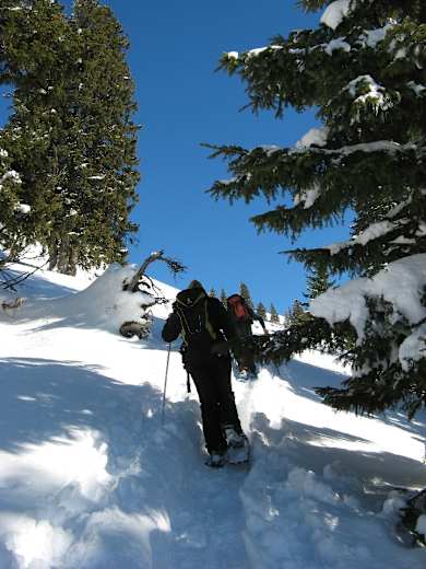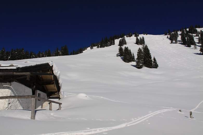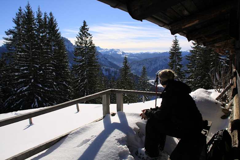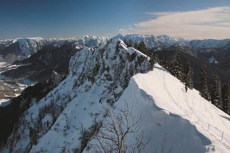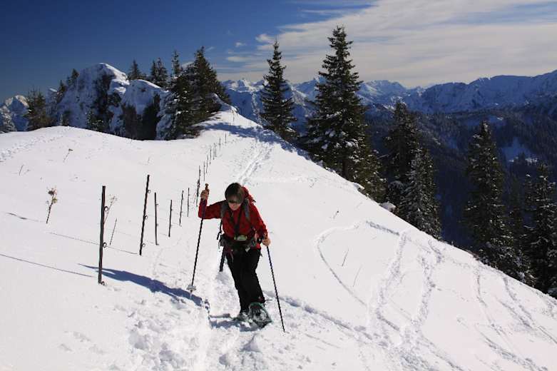 Wollen wir dann zum Gipfel in den Chiemgauer Alpen weitergehen, erleben wir einen abrupten Szenenwechsel: Steil ragt der Südhang der Haaralmschneid in den Himmel und erfordert den erfahrenen Schneeschuhgeher. Lawinensichere Verhältnisse und ein sicherer Schritt im Steilgelände sind notwendig, andernfalls beenden wir die Tour besser an den Almhütten. Da der Südhang auch eine beliebte Skitour ist, sollten wir auf die Skifahrer Rücksicht nehmen und die herrliche Abfahrt nicht zu sehr mit unseren Schneeschuhen zerpflügen.