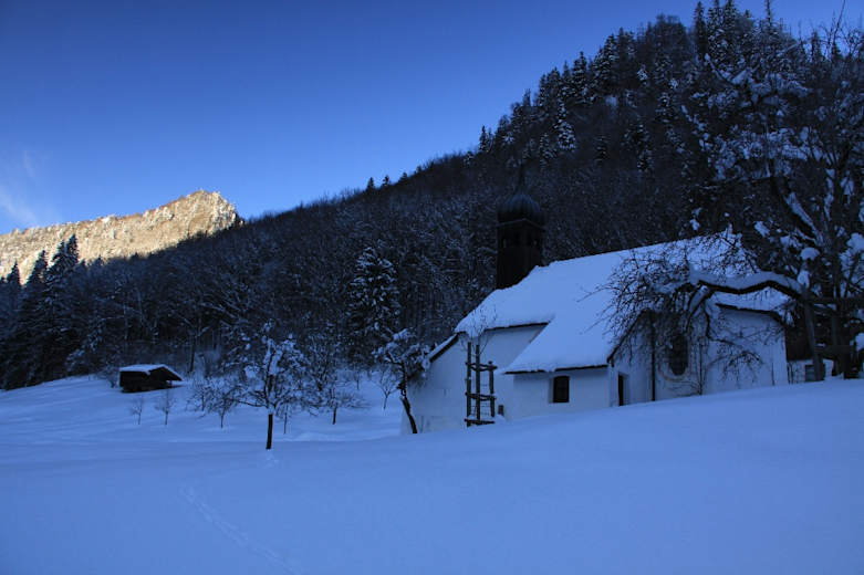 Vom Parkplatz wandern wir wenige Meter nach Norden an einer Kapelle vorbei zum Gehöft Urschlau, gehen zwischen den Gebäuden hindurch und biegen links in einen Waldweg ein. Sehr stimmungsvoll wandern wir durch tief verschneiten Winterwald entlang eines Grabens bergauf, bis wir auf eine breite Forststraße treffen.