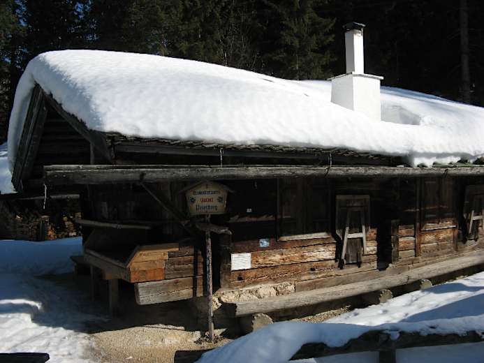 Auf unserem Weg kommen wir an einer weiteren Berühmtheit vorbei: einer der vier Brennhütten der Enzianbrennerei Grassl. Die schöne, alte Holzhütte, eine echte Touristenattraktion, liegt im tiefen Winterschlaf, den sie sich nach einer aufregenden Sommersaison redlich verdient hat.