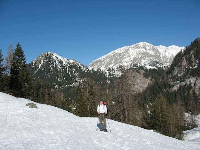 Wir gehen geradeaus weiter, wobei unsere Aufstiegsspur kurzzeitig sehr steil ist. Nach der Abzweigung des Anstiegs zum Jenner nach links wird unser Weg wieder bequemer. Durch lichten Wald, vorbei an alten Ahornbäumen, gelangen wir zur kleinen Brennhütte, wo sich eine kurze Pause geradezu aufdrängt. Dann nehmen wir das letzte Wegstück unter die Schneeschuhe und wandern in angenehmer Steigung über das Priesberger Moos zur herrlich gelegenen Priesbergalm.