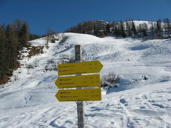 Nachdem wir den Wald verlassen haben, verläuft unser Aufstieg über freie Wiesenhänge entlang der Westflanke des Jenners nach Süden. Beeindruckend ist dabei der ständige Blick zum Watzmann. Anfangs steigt unser Weg nur wenig an, er verläuft dann nahezu auf einer Höhe und senkt sich zuletzt etwa 30 m hinab zu einem Wegweiser an der Wegteilung Königsbachalm, 1.270 m (die Königsbachalm liegt etwa 5 Min. unterhalb).