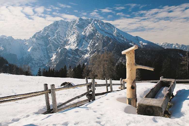 Genusswandern zur schönen Aussicht auf 1.460 m: Diese einfache und gemütliche Schneeschuhwanderung bietet uns eine solch großartige Aussicht, dass wir sie nur bei bestem Wetter unternehmen sollten. Der Blick von der Priesbergalm zu König Watzmann und seiner gewaltigen Ostwandzählt zu den eindrucksvollsten im Berchtesgadener Land.