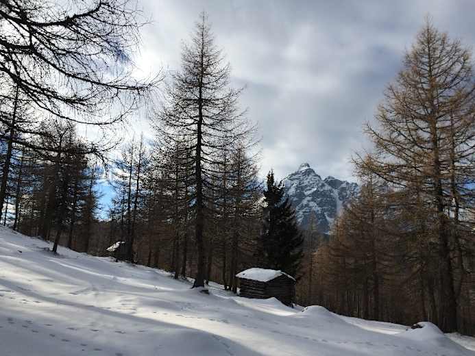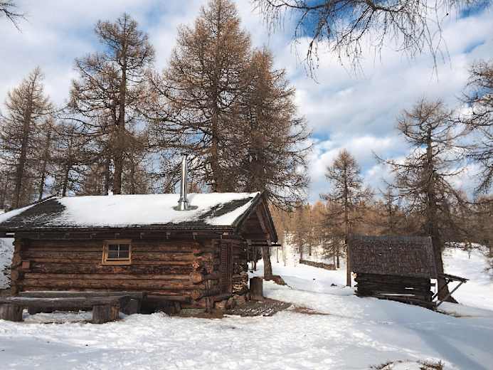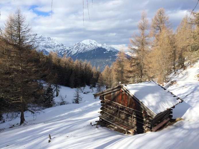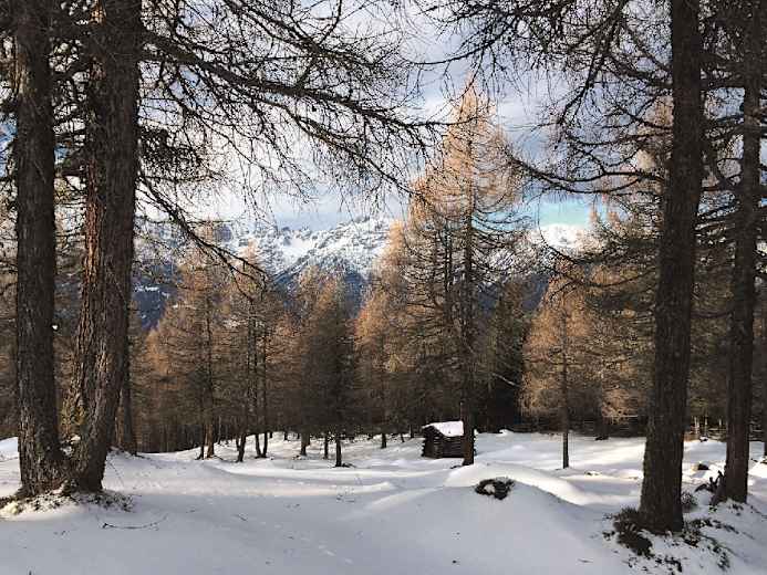 Rundwanderung zum Naturschauplatz Eulenwiesen in den Stubaier Alpen: Die Eulenwiesen mit ihrem lichten Lärchenwald und die sumpfigen, sonnigen Gleinser Mähder in Tirol bieten naturverbundenen Schneeschuhwanderern eine herrliche Rundwanderung mit unzähligen Holzhütten, die zu Recht als Naturschauplatz ausgeschildert sind.