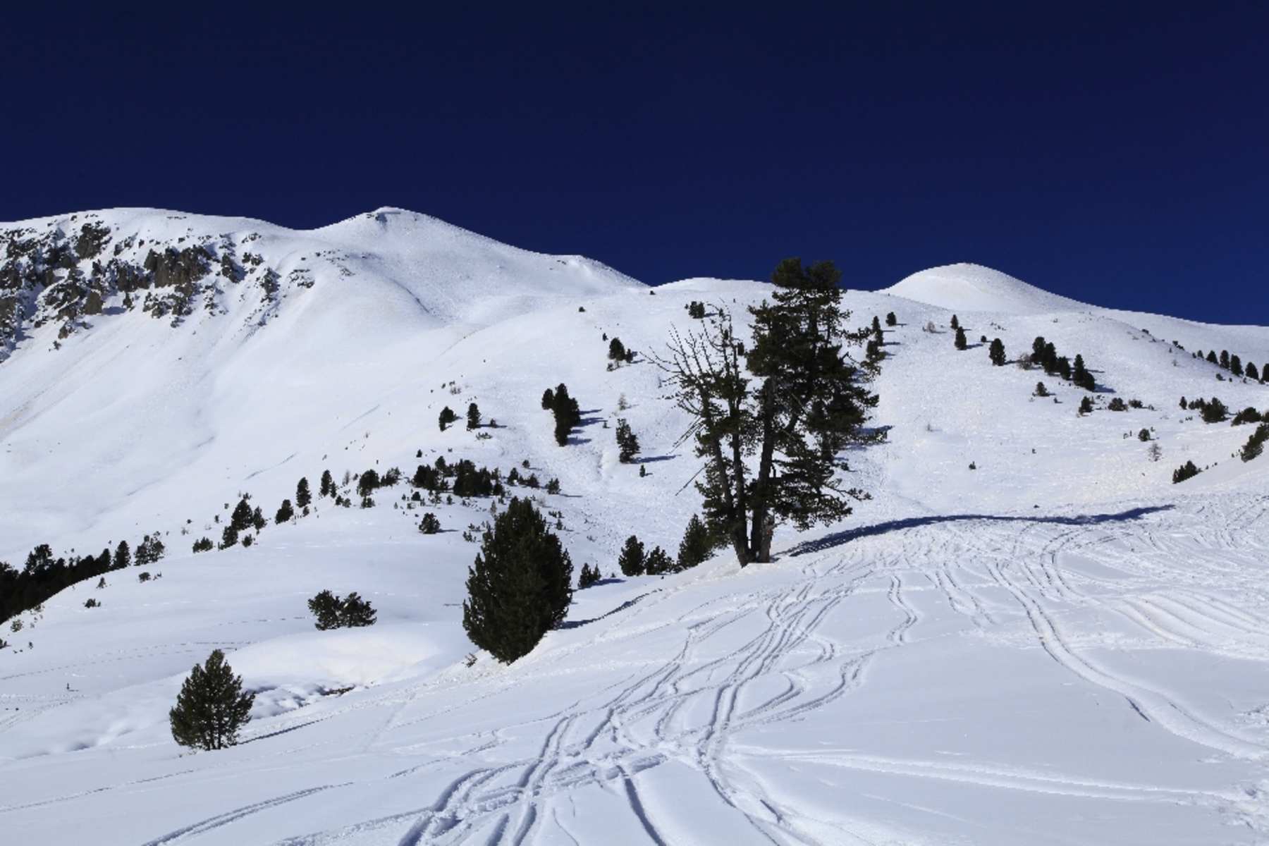 Nun geht es durch ein schönes Zirbenwäldchen in einem Links-Rechts-Bogen auf die Hochfläche Buffalora, 2.170 m, wo uns sofort der nahe Piz Daint fasziniert. Nahe einer großen, alten Zirbe zweigt unsere Spur von der Spur nach Jufplaun bzw. zum Piz Daint rechts ab und verläuft zunächst nur mäßig steigend nach Westen auf einen relativ steilen Hang zu. Diesen überwinden wir mit einigen Kehren und wenden uns auf der folgenden Verflachung wieder nach Süden.