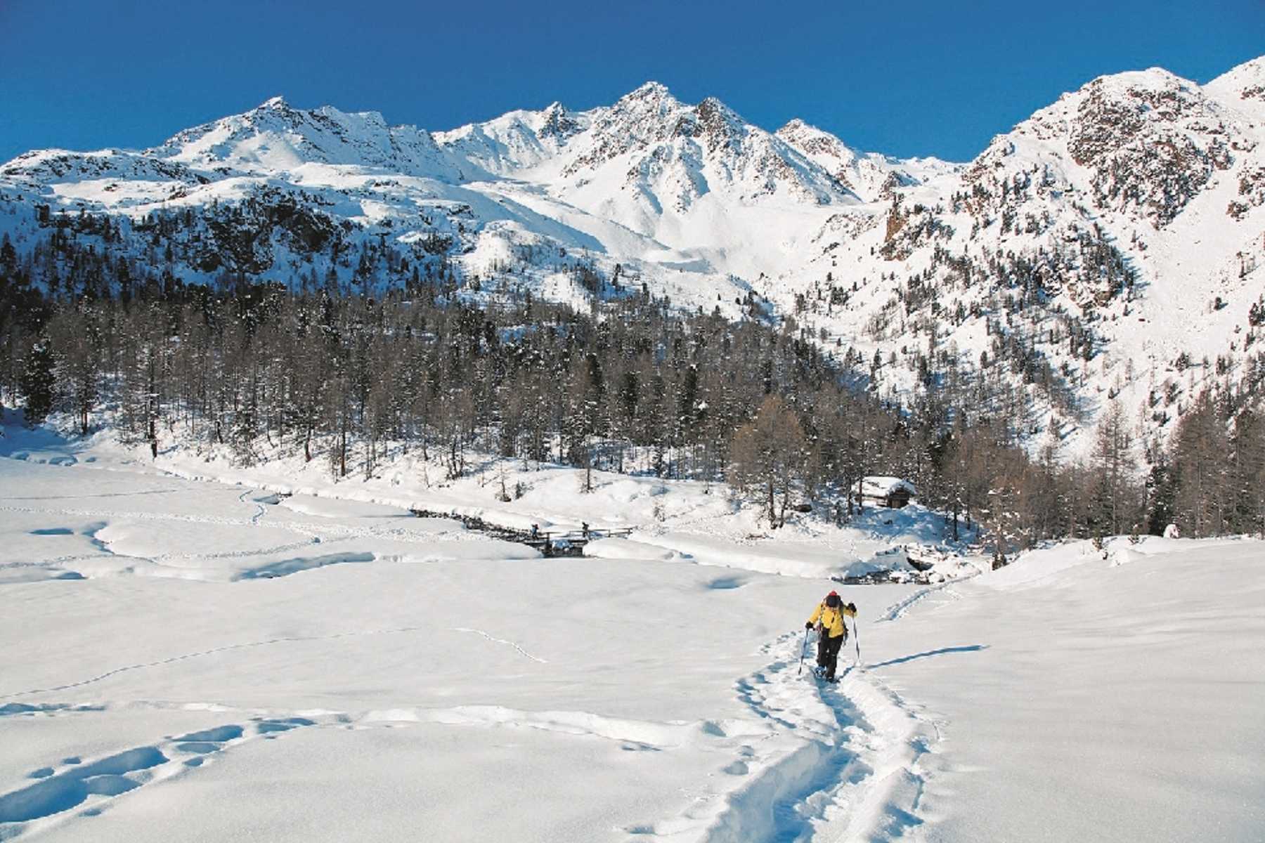 Eine Traumroute führt hinauf zum Gipfelsteinmann, durch lichten Lärchen- und Zirbenwald mit großen Felsblöcken und alten Wurzelstöcken, die mit einer dicken Schneehaube bedeckt sind, und vorbei an alten Almhütten. Wir überqueren die weite Schwemmebene des Falschauer Bachs und insgesamt fünf Brücken, wenn wir dem Fischersee, der etwas abseits unseres Weges unter einer dicken Eis- und Schneeschicht liegt, noch einen Besuch abstatten. Nach der Oberen Weißbrunnalm trennt sich unsere Spur von der Skiroute, die sich in das steile Kar „In den Wänden“ verabschiedet, während wir über schöne Mulden und einen letzten Aufschwung unserem Gipfel zustreben.