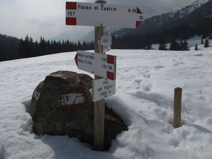 Vom Parkplatz gehen wir nach Norden und steigen durch einen kleinen Waldgürtel hinauf zu den Wiesen Prà del Signore, einer weiten, weißen Hochfläche, die wir nach Nordosten überqueren. Nahe einer kleinen Kapelle treffen wir auf einen nicht geräumten Fahrweg (eventuell Skidoospur vorhanden), der von der Malga Castrin herkommt und dem wir nach rechts zu einem Wegweiser, 1.785 m, folgen. Vom Wegweiser wandern wir auf dem mit „157“ markierten, breiten Weg weiter nach Osten in den Wald. Anfangs geht es leicht bergauf.