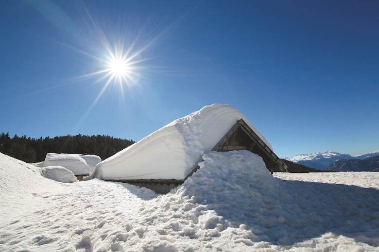 Auf verschlungenen Pfaden führen uns die Spuren durch den Wald und über kleine Lichtungen, immer den Markierungen des Sommerwegs Nr. 3 folgend, bis zu den Almwiesen von Laurein. Beim großen Almkreuz an der Laureinalm, 1.763 m, treffen wir auf den meist gut gespurten Weg Nr. 26 zurück zum Parkplatz Hofmahd. Es lohnt sich jedoch, an der (geschlossenen) Almhütte eine Rast einzulegen und den fantastischen Ausblick in die Brenta zu genießen.