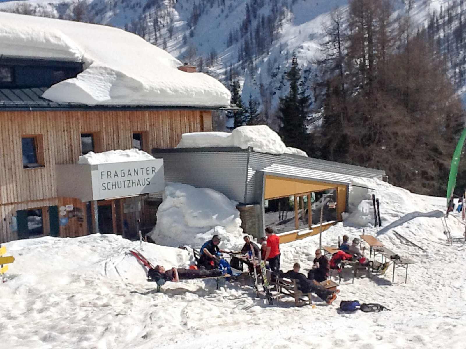 Vom Fraganter Schutzhaus führen zahlreiche Skitourenrouten weg. Es empfiehlt sich also auf der Hütte zu übernachten und sie zu einem Ausgangspunkt für Skitouren auf die umliegenden Gipfel zu machen.