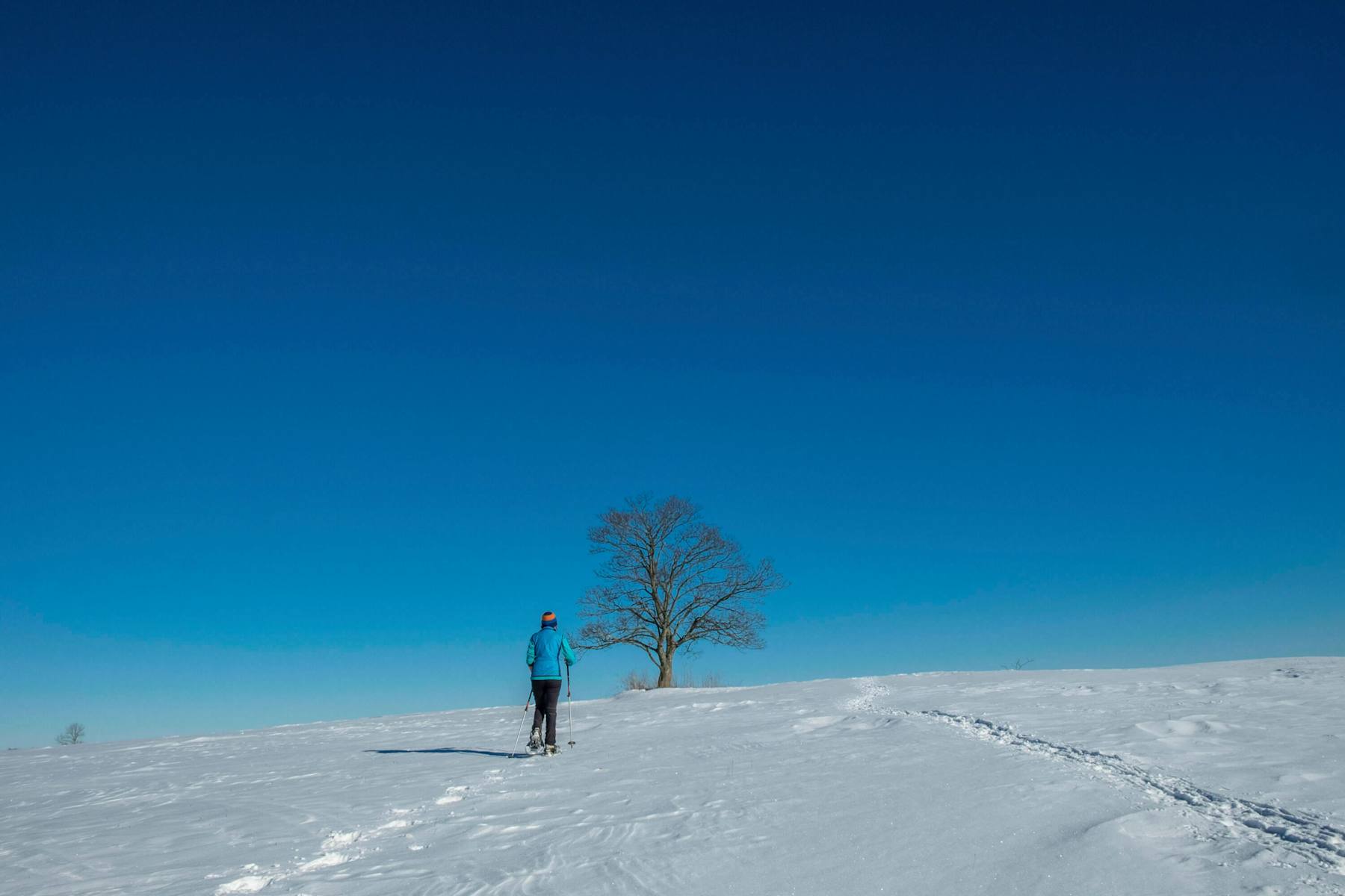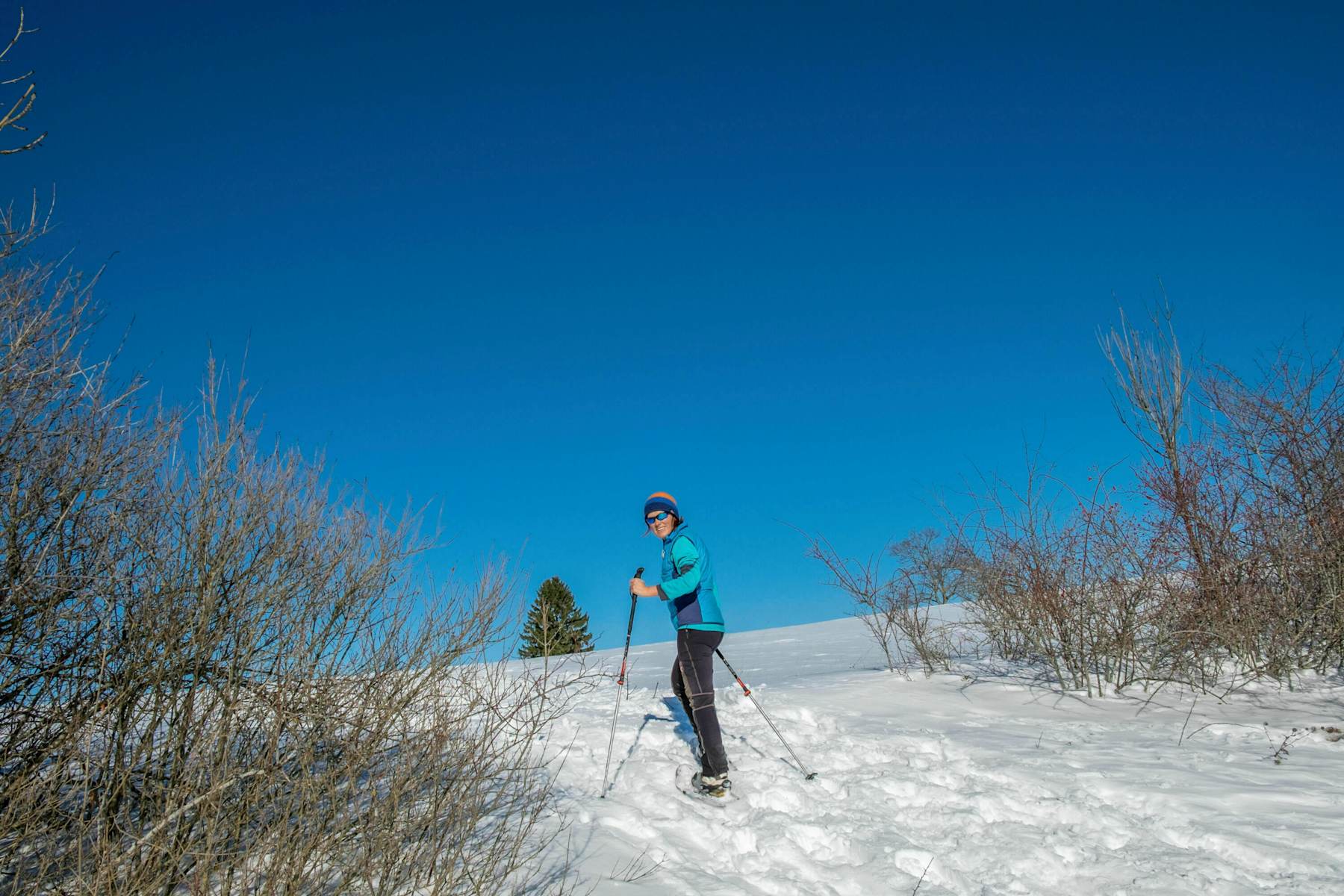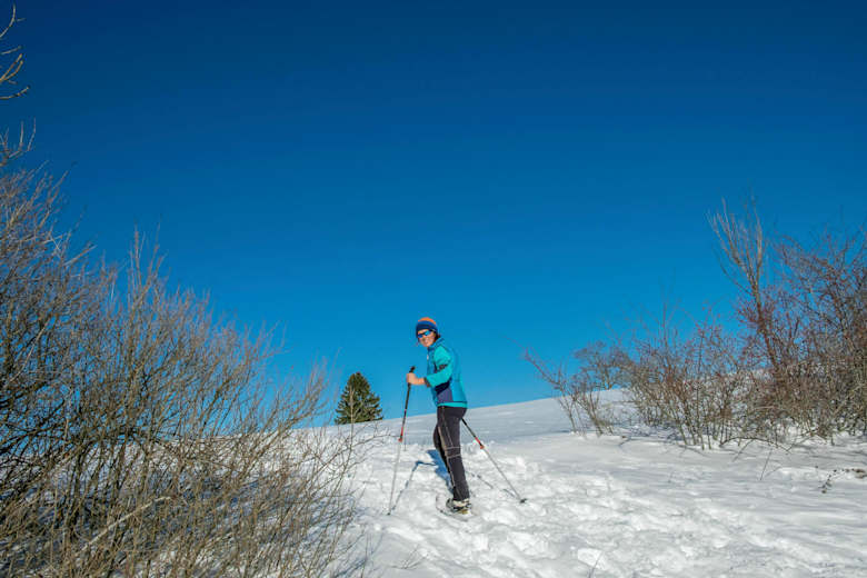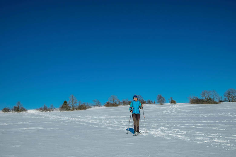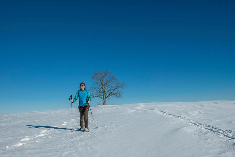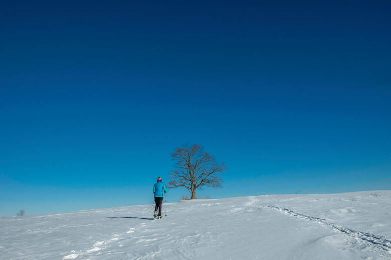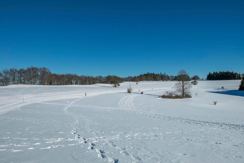Nun befindet man sich auf dem Sommerweg, dem man nach rechts am Albtrauf entlang folgt. Nach einer Weile dreht die Spur nach rechts ab und überquert die Loipe. Der ausgeschilderte Schneeschuhtrail bringt Schneeschuhwanderer nun wieder zurück zum Parkplatz.