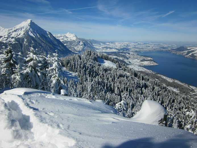 Aussichtsreich im Schnee hinauf, mit Blick zum Thuner- und Brienzersee, sowie bis zu den Berner Hochalpen, das alles vereint eine schwerere Schneeschuhtour von Aeschiried zur Brunnihütte (1.646 m). Im freien Gelände, sowie auf Forstwegen wandert man über Greberegg zur Brunnihütte unterm Morgenberghorn im Kanton Bern. Eine lohnende Schneeschuhtour im Berner Oberland mit einem faszinierendem Ausblick.