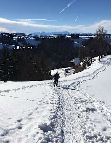 Bei der Bushaltestelle Axalp/Sportbahnen liegt der Start dieser leichten Schneeschuhwanderung oberhalb vom Brienzersee. Der Trail folgt dem sommerlichen „Schnitzlerweg“, welcher hinter dem Restaurant Axallp Stübli beginnt. Relativ hangparallel führt der Weg zunächst an einen kleinen Rücken nördlich von Chrutmettli, von welchem man eine tolle Aussicht ins Tal und auf den Brienzersee, sowie Brünigpass hat.