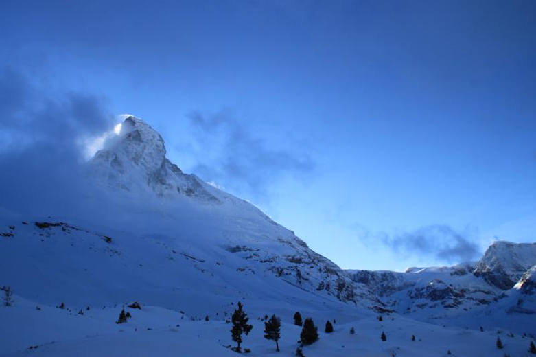 Ab Schwarzsee führt der Schneeschuhtrail am Fuss der Matterhorn Nordwand durch die fantastische Landschaft der Stafelalp. Die schwarze Wand beeindruckt und es ist kaum zu glauben, dass es sogar Alpinisten gab, die die Wand im Winter durchstiegen - die Kälte, die von der Wand ausgeht, ist selbst auf dem Schneeschuhtrail spürbar.