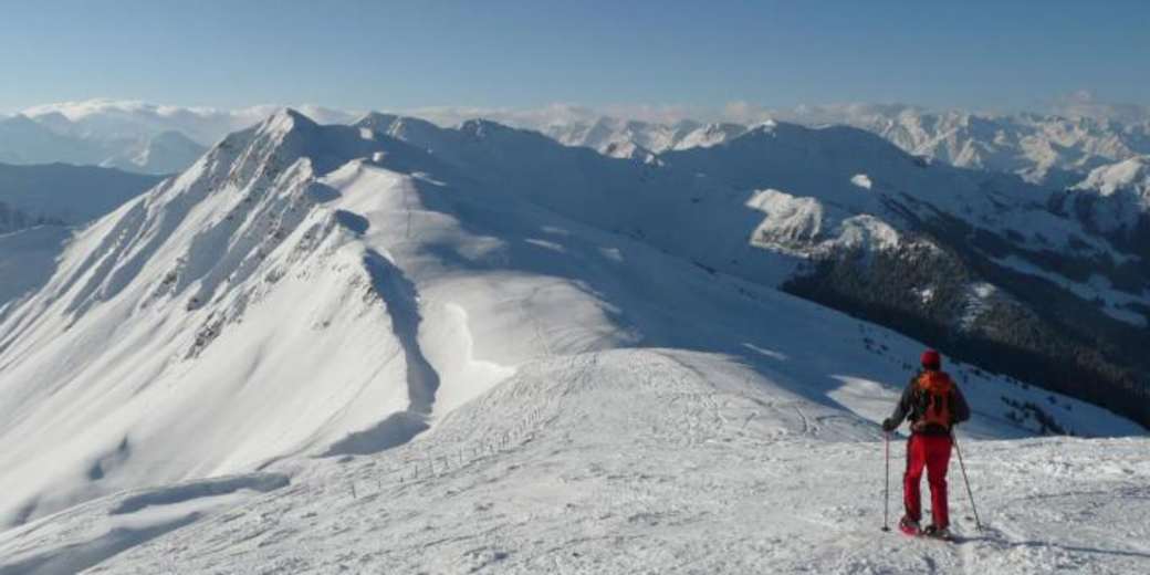 Die Schneeschuhwanderung auf den Stemmerkogel, 2.123 m, in den Kitzbühler Alpen ist dank Seilbahnunterstützung ausgehen von Saalbach Hinterglemm leicht zu bewältigen. Tatsächlich hat man weniger Aufstiegsmeter als Abstiegsmeter und kann die Sonne in vollen Zügen genießen.