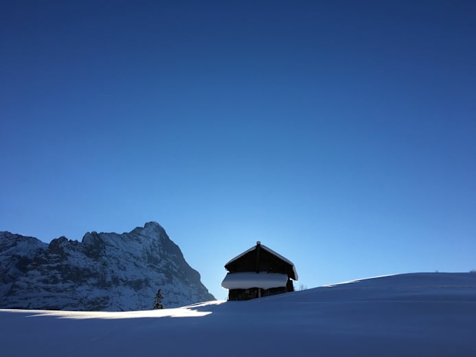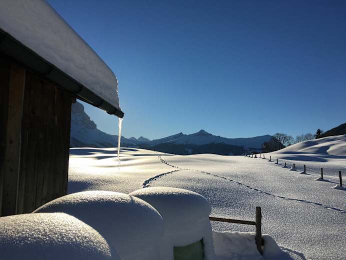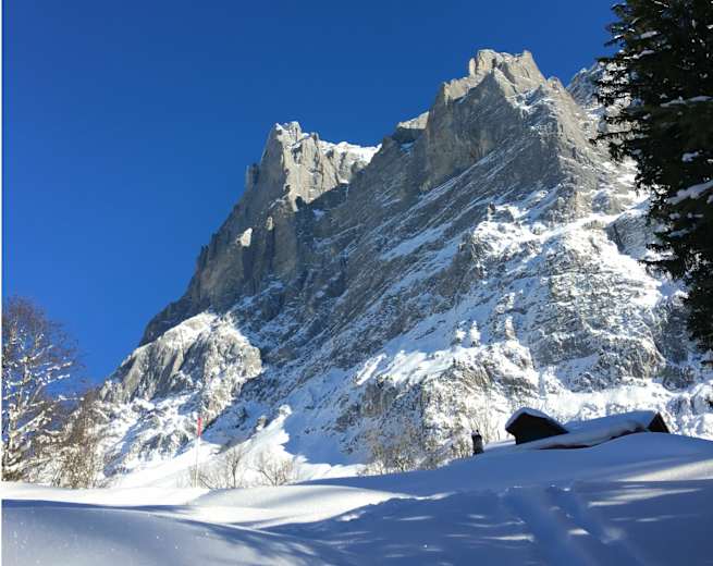 Alternativ beim Weidli über verschneite Wiesen zur Ischbodenhütte und zum Unteren Lauchbühl (1.401 m). Vom Fusse des Wetterhorns bietet sich ein fantastische Panorama über den Oberen Grindelwaldgletscher, das Chrinnenhorn sowie die Ostwand des Eigers.