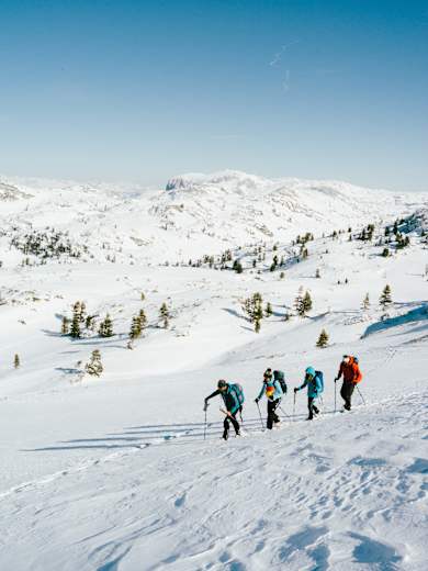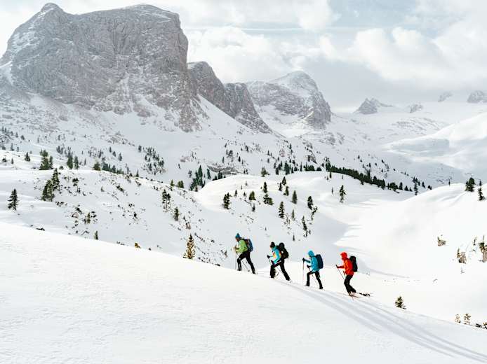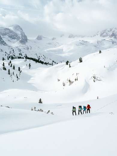 In drei Tagen mit den Schneeschuhen aus der steirischen Ramsau über das Dachsteinplateau bis nach Obertraun in Oberösterreich. Etappe 3 führt vom Wiesberghaus durch die sogenannte Bärengasse zur Gjaidalm und von dort weiter zur Krippensteinbahn, mit der es schließlich abwärts bis nach Obertraun geht.