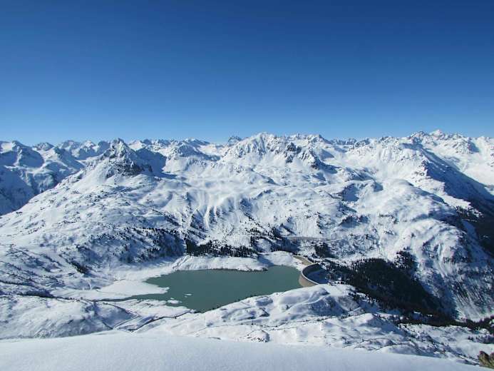 Diese Schneeschuhtour ist für den Anfänger wie auch den Genußschneeschuhwanderer etwas. Ohne Anstrengung geht es um den Kops Stausee in der Verwallgruppe in Vorarlberg und dann sanft ins Tal hinab.