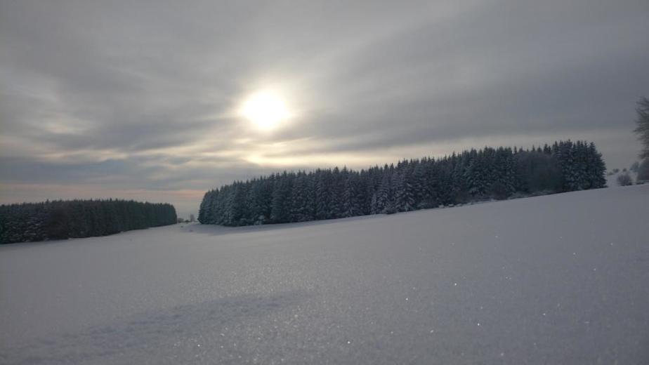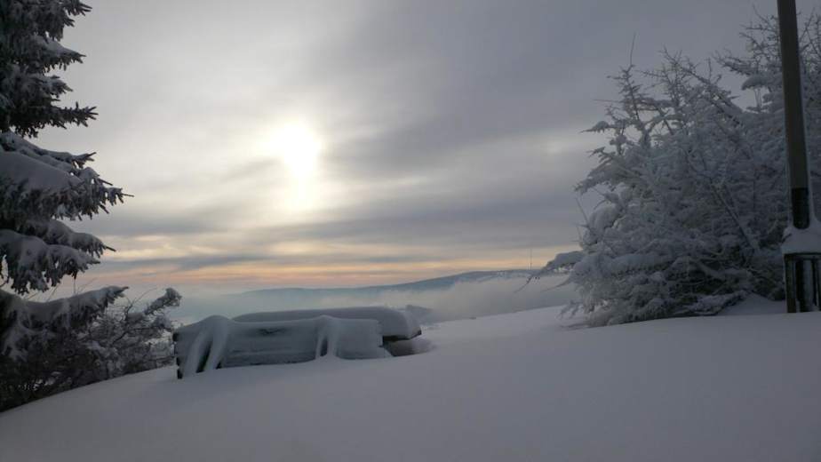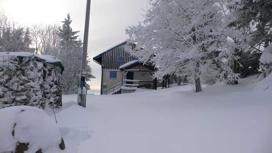 Schneeschuhwanderung vom Parkplatz Schwedenwall durch Waldgebiet hinauf zur Würzburger Bergbund Hütte (888 m). Lohnende Winterwanderung im bayerischen Rhön.