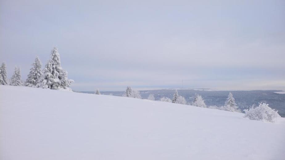 Leicht ansteigender Weg an verschneiten Wäldern vorbei zur Würzburger Bergbund Hütte (888 m).