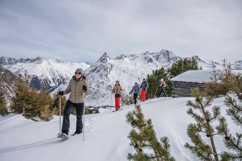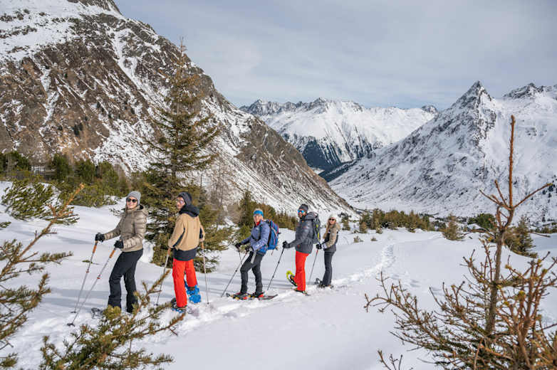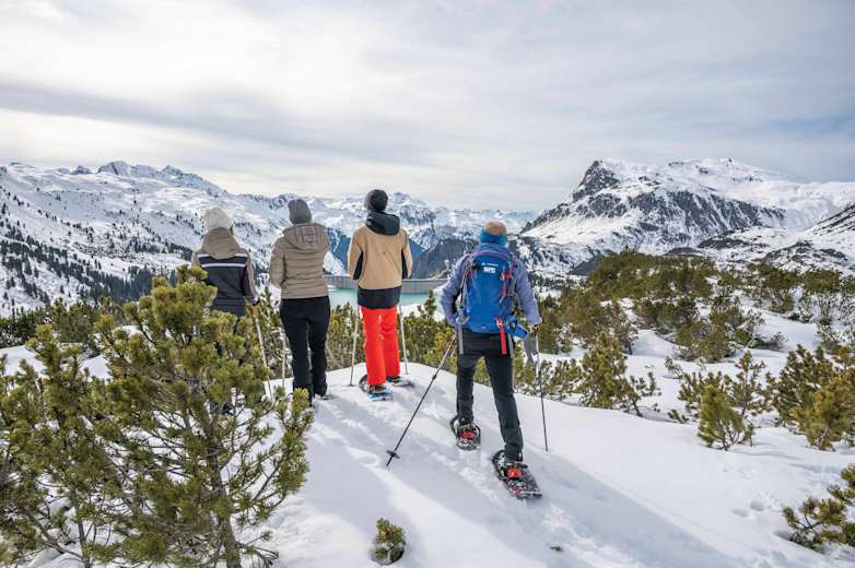 Dank Seilbahn beginnt diese Schneeschuhwanderung oberhalb von Galtür im Paznaun in Tirol schon auf knapp 2.000 Metern Seehöhe im Skigebiet Silvapark.